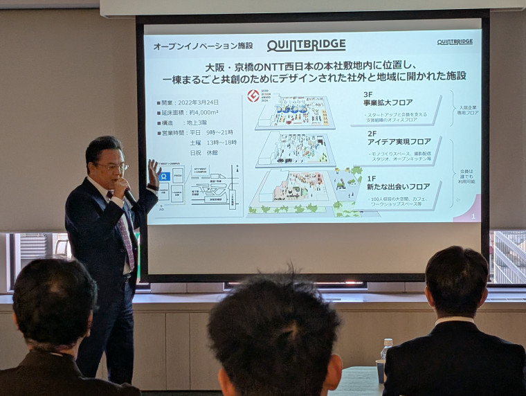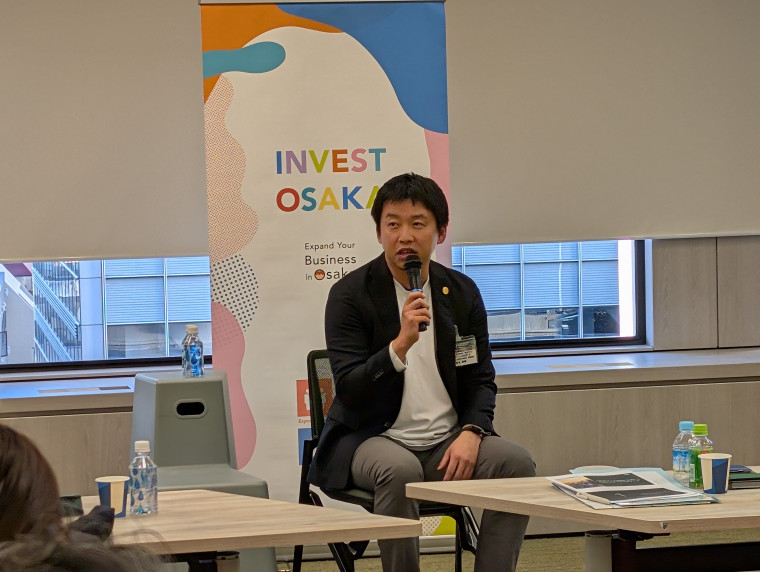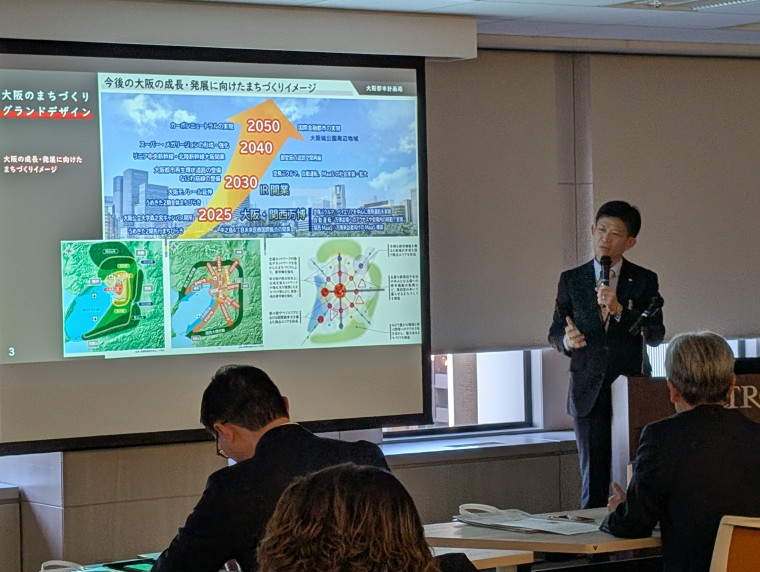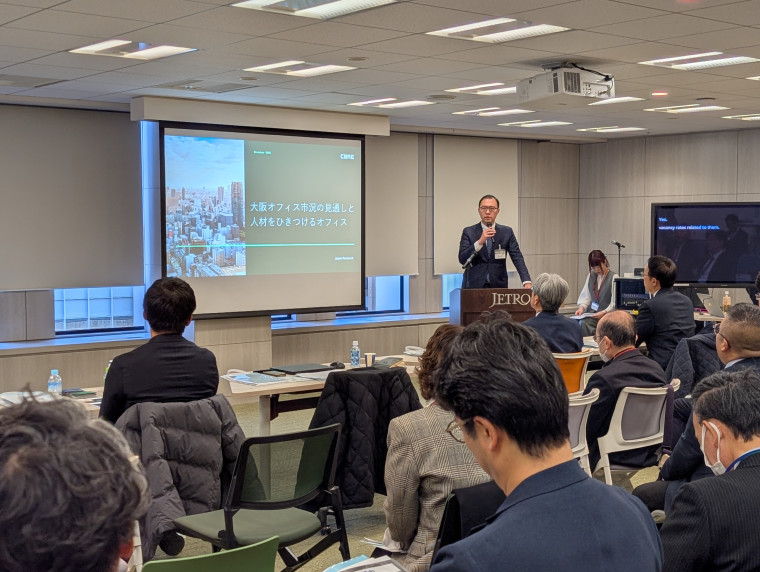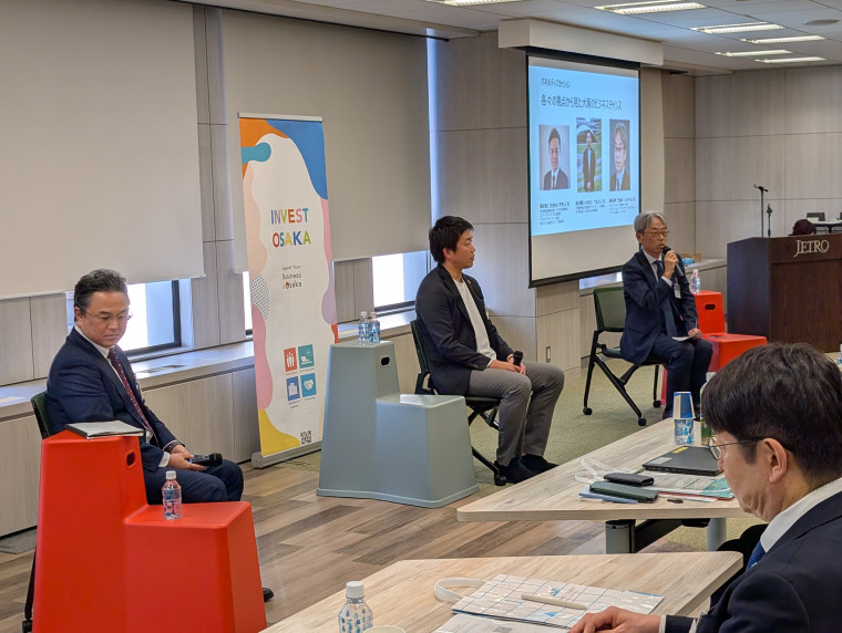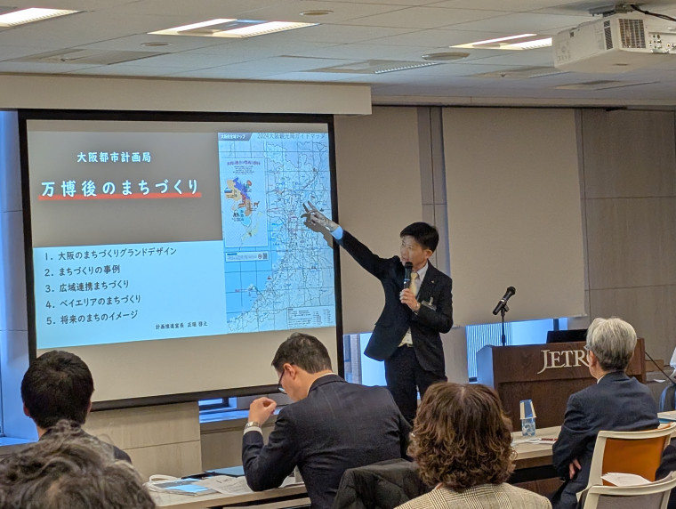 | 内容 | セミナーの開催にあたり、大阪市経済戦略局 太田 守二立地交流推進部長が主催者を代表して挨拶を行った後、大阪都市計画局 正垣 啓之計画推進室長より「万博後のまちづくり」と題して、大阪のまちづくりグランドデザインを紹介し、うめきたやヒガシエリア(大阪城東部地区)、新大阪駅周辺の開発をはじめとする大阪の成長・発展に向けた様々なまちづくりやエリア活性化の事例について案内しました。 続いて、シービーアールイー株式会社の岩間 有史氏より「大阪オフィス市況の見通しと人材をひきつけるオフィス」と題して、全国のオフィス市場における賃料の上昇や空室率の低下について、企業マインドの改善、企業の人手不足、より優れたオフィスへの移転需要といった側面から分析するとともに、他都市と比較した大阪のオフィス市場の現況と、今後の開発動向を見据えた将来性が述べられ、賃料上昇と空室率低下が今後も続く見通しであることから、早めの大阪移転・物件確保を呼びかけました。 パネルディスカッションではシービーアールイー株式会社の魚見 修平ディレクターをファシリテーターとして、「各々の視点から見た大阪のビジネスチャンス」をテーマに、NTT西日本株式会社の滝本部長、三菱地所株式会社の岩元室長を檀上に迎え、QUINTBRIDGEやグラングリーン大阪をはじめとするヒガシエリア・キタエリアのイノベーション拠点における取組みや、企業間連携の可能性、両エリアのポテンシャルや、更なる発展に向けた今後の展望について語っていただきました。 その後、大阪市経済戦略局より災害時等のバックアップ拠点の立地先としての大阪の強みと、大阪市への進出にかかる助成制度について紹介し、最後に独立行政法人日本貿易振興機構大阪本部から同機構の事業概要を案内しました。 今回のセミナーは、AIによるライブ通訳システムを活用し、会場前方のスクリーンに日本語と英語の通訳文を表示して参加者にご覧いただきました。 セミナー終了後には、各登壇者や大阪府・市担当者と参加企業との交流会を開催しました。 |